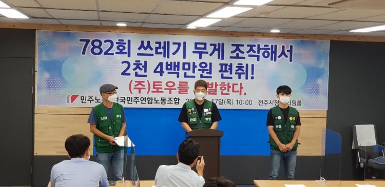 ÀüÁֽà û¼Ò´ëÇà¾÷ü ±Ù·ÎÀÚµéÀÌ ¼ÓÇÑ ¹ÎÁÖ³ëÃÑ Àü±¹¹ÎÁÖ¿¬Çճ뵿Á¶ÇÕ ÀüÁÖÁöºÎ´Â 17ÀÏ ÀüÁÖ½Ãû ºê¸®Çη뿡¼­ ±âÀÚȸ°ßÀ» ¿­¾î "¢ßÅä¿ìÀÇ Ã»¼ÒÂ÷ ¿îÀü¿ø 1¸íÀÌ 2³â°£ ÃÑ 782ȸ¿¡ °ÉÃÄ Â÷·®¹«°Ô¸¦ Á¶ÀÛÇØ 2400¸¸¿ø »ó´çÀÇ ºÎ´çÀÌÀÍÀ» »çÃø¿¡ Áá´Ù"°í ÁÖÀåÇß´Ù.
