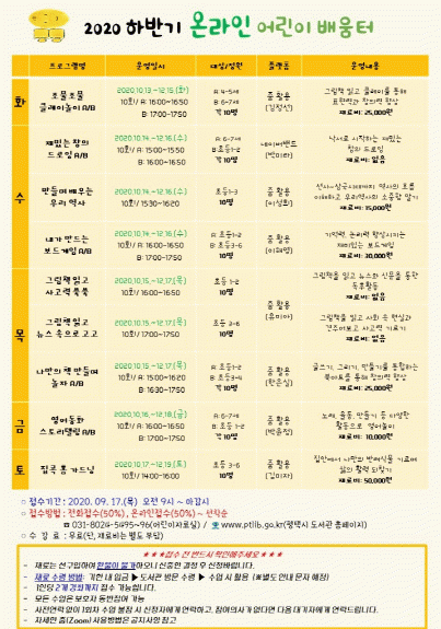 ¿Â¶óÀÎ ÇнÀ ¹æ¹ýÀº µµ¼°ü ȨÆäÀÌÁö¸¦ ÅëÇØ ¾È³» ÁßÀ̸ç, ¸ðµç ¼ö¾÷Àº ¹«·á·Î Âü°¡ °¡´ÉÇϸç(´Ü, Àç·áºñ´Â º°µµºÎ´ã) ÇÁ·Î±×·¥ ½Åû Á¢¼ö´Â 9¿ù 17ÀÏ(¸ñ)ºÎÅÍ ÀüÈ ¹× µµ¼°ü ȨÆäÀÌÁö¸¦ ÅëÇØ °¡´ÉÇÏ´Ù. ÇÁ·Î±×·¥¿¡ °üÇÑ ÀÚ¼¼ÇÑ ³»¿ëÀº ȨÆäÀÌÁö °øÁö»çÇ×À» È®ÀÎÇϰųª ÀüÈ(¾î¸°ÀÌ½Ç ¢Ï031-8024-5495~6)·Î ¹®ÀÇÇϸé ÀÚ¼¼ÇÑ ¾È³»¸¦ ¹ÞÀ» ¼ö ÀÖ´Ù.