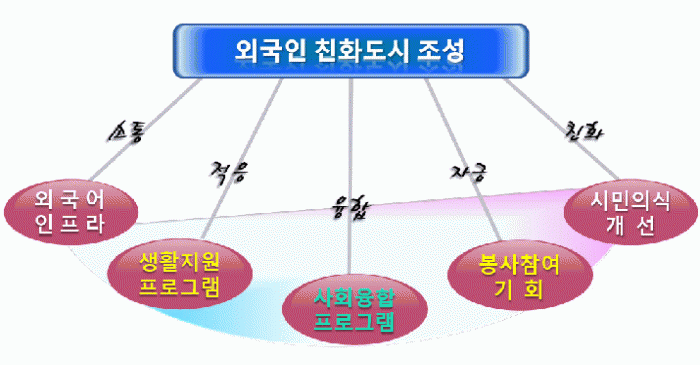 ¿Ü±¹ÀÎÀÇ Çѱ¹ »ýȰ ÀûÀÀÀ» µ½±â À§ÇØ °ÅÁÖ ¿Ü±¹ÀÎ 1:1 ¸àÅäÁ¦, ¿Ü±¹ÀÎ »ó´ãⱸ ¿î¿µ, »çȸ¡¤Àαǡ¤¹ý·ü ±³À°, Çѱ¹¾î ±³À° ¹× Çѱ¹¹®È üÇè µî ´Ù¾çÇÑ ÇÁ·Î±×·¥À» ¿î¿µÇØ ³ª°¥ °èȹÀÌ´Ù.