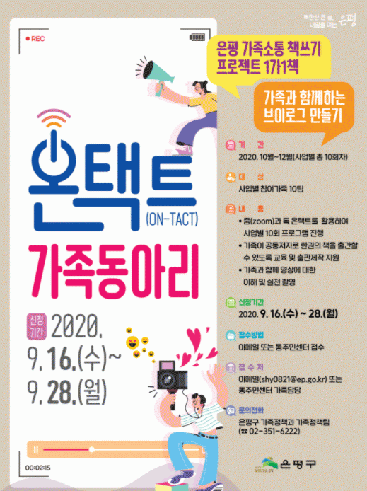 ¡®2020. ¿ÂÅÃÆ® °¡Á·µ¿¾Æ¸®»ç¾÷¡¯Àº 9¿ù 16ÀϺÎÅÍ 28ÀϱîÁö À̸ÞÀÏ(shy0821@ep.go.kr) ¶Ç´Â µ¿Áֹμ¾ÅÍ °¡Á·´ã´ç¿¡°Ô ½ÅûÇÏ¸é µÈ´Ù. ±âŸ ÀÚ¼¼ÇÑ ³»¿ëÀº ÀºÆò±¸Ã» °¡Á·Á¤Ã¥°ú(02-351-6222)·Î ¹®ÀÇÇÏ¿© È®ÀÎÇÒ ¼ö ÀÖ´Ù.