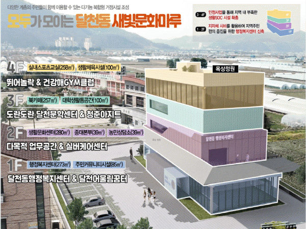 ½Ã´Â ¿À´Â 2022³â±îÁö ±¹ºñ 20¾ï ¿ø, µµºñ 3¾ï ¿ø, ½Ãºñ 37¾ï ¿ø µî ÃÑ 60¾ï ¿øÀÇ »ç¾÷ºñ¸¦ ÅõÀÔÇØ Çö ´Þõµ¿ÇàÁ¤º¹Áö¼¾ÅÍ ºÎÁö¿¡ ¿¬¸éÀû 1,751§³, 4Ãþ ±Ô¸ðÀÇ °ø°øÃ»»ç¿Í »ýȰ SOC ½Ã¼³À» º¹ÇÕÈÇÑ °Ç¹°À» Á¶¼ºÇÒ °èȹÀÌ´Ù.