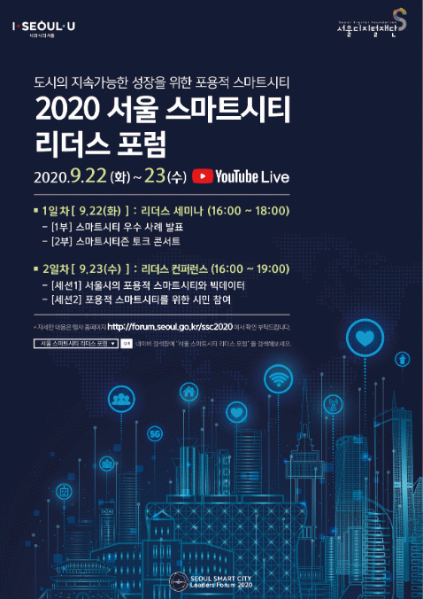¼¿ï½Ã´Â ¡¸2020 ¼¿ï ½º¸¶Æ®½ÃƼ ¸®´õ½º Æ÷·³¡¹À» 9¿ù22ÀÏ(È)~23ÀÏ(¼ö) ¡®¹«°üÁß?¿Â¶óÀΡ¯À¸·Î °³ÃÖÇÑ´Ù°í ¹àÇû´Ù. ¡®Æ÷¿ëÀû ½º¸¶Æ®½ÃƼ¡¯¸¦ ÁÖÁ¦·Î ¹Ì±¹ LA, Çɶõµå Çï½ÌŰ µî 11°³±¹ µµ½Ã¿Í ½º¸¶Æ®½ÃƼ ºÐ¾ß ¸®´õµéÀÌ ¡®ºñ´ë¸é¡¯À¸·Î ¸¸³ª ¸Ó¸®¸¦ ¸Â´í´Ù.