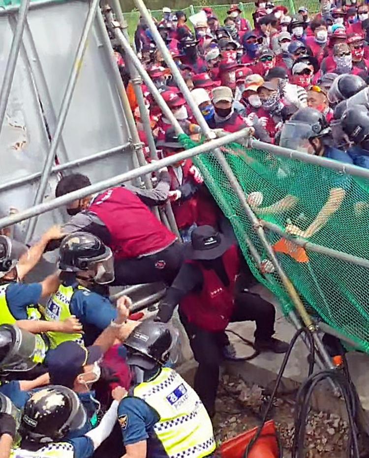 ´ç½Ã ³ëÁ¶´Â B°Ç¼³»ç°¡ ¹ÎÁÖ³ëÃÑ ¼Ò¼Ó Á¶ÇÕ¿ø ä¿ëÀ» °ÅºÎÇÏÀÚ ºÎ´ç ³ëµ¿ ÇàÀ§ Áß´ÜÀ» ¿ä±¸ÇÏ´Â Áýȸ¸¦ ¿¾ú´Ù. ´Ù¸¸ »çȸÀû °Å¸® µÎ±â 2´Ü°è¿¡ µû¶ó Áýȸ ÀοøÀ» 99¸íÀ¸·Î ½Å°íÇßÁö¸¸, ÇöÀå¿¡´Â 650¿©¸í(°æÂû Ãß»ê)ÀÌ ¸ð¿´´Ù.