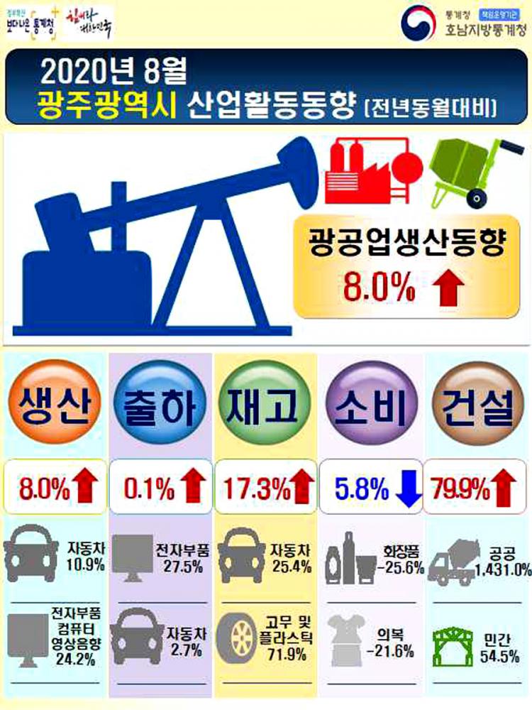 ±¤ÁÖÁö¿ª ±¤°ø¾÷ »ý»êÀº ÀÚµ¿Â÷(10.9%), ÀüÀÚºÎǰ¡¤ÄÄÇ»ÅÍ¡¤¿µ»óÀ½ÇâÅë½Å(24.2%), ±â°èÀåºñ(15.8%) µîÀº Áõ°¡ÇßÁö¸¸ 1Â÷±Ý¼Ó(-31.2%), ±Ý¼Ó°¡°ø(-18.6%) µîÀÌ Å©°Ô °¨¼ÒÇØ Àü¿ù ´ëºñ 2.7% ÁÙ¾ú´Ù.