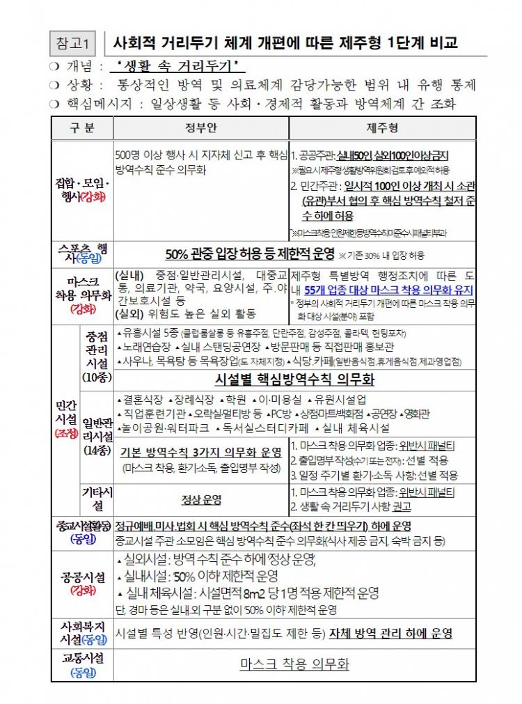 Á¦ÁÖÇü »çȸÀû °Å¸®µÎ±â 1´Ü°è °³Æí¾È¿¡´Â ¡ãÁ¦ÁÖÁö¿ª °Å¸®µÎ±â ´Ü°èº° »óÇâ ±âÁØ ¸¶·Ã ¡ã°ø°ø¡¤¹Î°£ ÁÖ°ü ÁýÇÕ ¸ðÀÓ¡¤Çà»ç ´ë»ó ÁýÁ߹濪°ü¸® À¯Áö ¡ãµµ³» 55°³ ¾÷Á¾ ´ë»ó ¸¶½ºÅ© Âø¿ë Àǹ«È ¡ãµµ³» ´ÙÁßÀÌ¿ë½Ã¼³ ´ë»ó ÁßÁ¡(10°³¼Ò)¡¤ÀϹÝ(14°³¼Ò) °ü¸®½Ã¼³ ÁöÁ¤ µîÀÇ ³»¿ëÀÌ Æ÷ÇԵƴÙ.