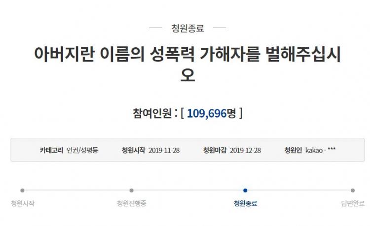 Áö³ÇØ 11¿ù '¾Æ¹öÁö¶õ À̸§ÀÇ ¼ºÆø·Â °¡ÇØÀÚ¸¦ ¹úÇØ ÁֽʽÿÀ'¶ó´Â û¿Í´ë ±¹¹Îû¿ø °Ô½Ã±ÛÀº 10¸¸9696¸íÀÇ µ¿ÀǸ¦ ¸ð¾Ò´ø °Ô ´ëÇ¥ÀûÀÌ´Ù. û¿øÀÎÀº ±Û¿¡¼ ÀÚ½ÅÀÌ 12¼¼ºÎÅÍ 19¼¼±îÁö Ä£ºÎ¿¡°Ô ¼ºÆø·ÂÀ» ´çÇÑ µÚ ¹Ì±¹À¸·Î ¶°³µÀ¸¸ç, 17³â¸¸¿¡ ±Í±¹ÇØ °æÂûÀ» ã¾ÒÀ¸³ª "°ø¼Ò½ÃÈ¿°¡ Áö³ª µµ¿òÀ» ¹ÞÀ» ¼ö ¾ø´Ù"´Â ´äÀ» ¹Þ¾Ò´Ù°í ÁÖÀåÇß´Ù.