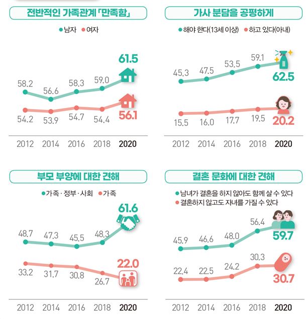 °¡»ç¸¦ °øÆòÇÏ°Ô ºÐ´ãÇØ¾ß ÇÑ´Ù°í »ý°¢ÇÏ´Â ºñÁßÀº 62.5%·Î 2³â Àüº¸´Ù 3.4%Æ÷ÀÎÆ®(p) Áõ°¡Çß´Ù. ¾Æ³»°¡ ÁÖµµÇØ¾ß ÇÑ´Ù°í »ý°¢ÇÏ´Â ºñÁßÀº 34.8%·Î 2018³â(38.4%)º¸´Ù 3.6%p °¨¼ÒÇß´Ù.