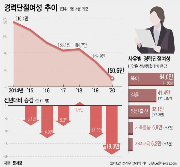ÇÑÆí, 15~54¼¼ ±âÈ¥¿©¼º Áß Ãë¾÷ÀÚ(515¸¸8000¸í)ÀÇ °æ·Â´ÜÀý °æÇèÀ» »ìÆìº¸¸é °áÈ¥, Àӽš¤Ãâ»ê, À°¾Æ, Àڳ౳À°, °¡Á·µ¹º½ ¶§¹®¿¡ Á÷ÀåÀ» ±×¸¸µÐ ÀûÀÌ ÀÖ´Â °æÇèÀÚ´Â 214¸¸1000¸íÀ¸·Î Àü³âº¸´Ù 7¸¸3000¸í(-3.3%) °¨¼ÒÇß´Ù.