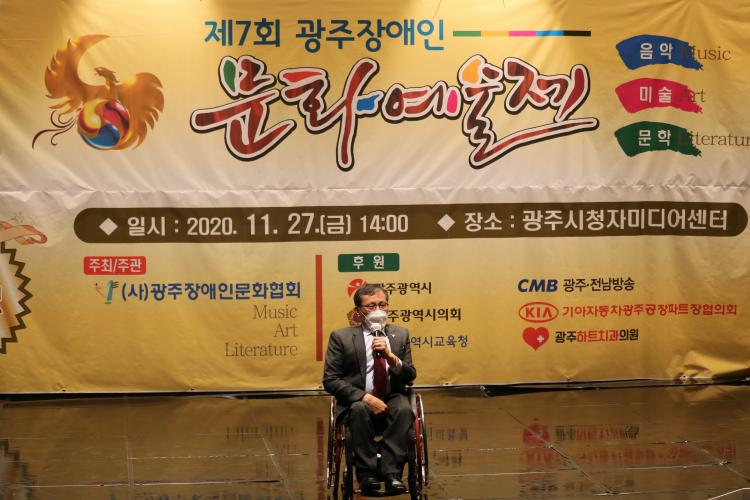 Á¤Áø»ï ±¤ÁÖÀå¾ÖÀι®ÈÇùȸ ȸÀåÀº ±â³ä»ç¸¦ ÅëÇØ ¡°±¹°¡Àû Àç³ÀÎ Äڷγª19°¡ ¾öÁßÇÑ ½Ã±âÀÓ¿¡µµ ºÒ±¸ÇÏ°í ´Ù¾çÇÑ ¹®È¿¹¼ú ºÐ¾ß¿¡¼ °¢°íÀÇ ³ë·ÂÀ¸·Î ´ÙÀç´Ù´ÉÇÑ ¿¹¼úÀÇ Àç´ÉÀ» ¹ßÈÖÇÑ ¼ö»óÀÚ ¿©·¯ºÐµéÀÇ ³ë°í¸¦ Ä¡ÇÏÇÑ´Ù¡±¸ç ¡°Ã¢ÀÛ ±×¸®°í °¨µ¿ÀÌ ÀÖ´Â ¡¯±¤ÁÖÀå¾ÖÀι®È¿¹¼úÁ¦¡®¸¦ ÅëÇØÀå¾ÖÀÎ ¹®È¿¹¼úÀÌ ÇѰÉÀ½ ¹ßÀüÇÏ´Â °á°ú·Î À̾îÁ³À¸¸é ÇÏ´Â ¹Ù·¥ÀÌ´Ù¡±¶ó°í ¸»Çß´Ù.