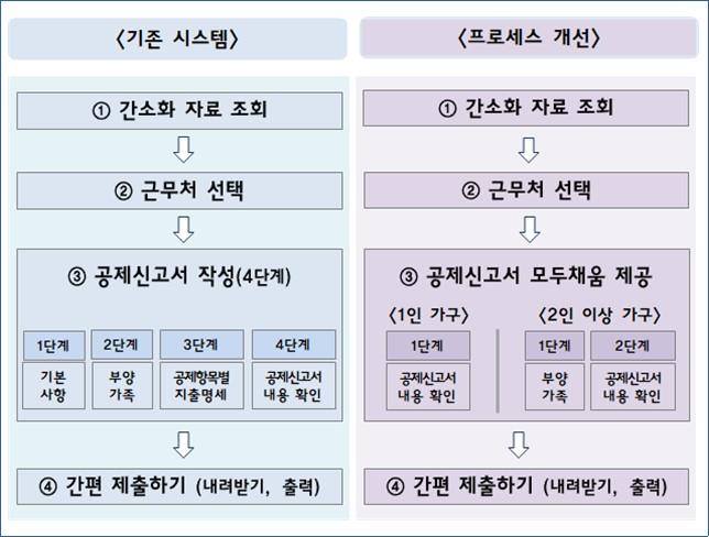 ½Å°í¼ ÀÛ¼º °úÁ¤µµ °£ÆíÇØÁ³´Ù. '°£¼ÒÈ ÀÚ·á Á¶È¸¡æ±Ù¹«Ã³ ¼±ÅÃ¡æ°øÁ¦ ½Å°í¼ ÀÛ¼º¡æ°£Æí Á¦Ãâ' ÀýÂ÷ Áß °øÁ¦ ½Å°í¼ ÀÛ¼ºÀÌ ½¬¿öÁ³´Ù. '±âº» »çÇ× ÀÔ·Â/È®ÀΡæºÎ¾ç°¡Á· ÀÔ·Â/È®ÀÎ¡æ°øÁ¦ Ç׸ñº° ÁöÃâ ¸í¼¼ ÀÔ·Â/È®ÀÎ¡æ°øÁ¦ ½Å°í¼ ³»¿ë È®ÀÎ' °úÁ¤ÀÌ 1ÀÎ °¡±¸´Â '°øÁ¦ ½Å°í¼ ³»¿ë È®ÀÎ'À¸·Î, 2ÀÎ ÀÌ»ó °¡±¸´Â 'ºÎ¾ç°¡Á· ÀÔ·Â/È®ÀÎ¡æ°øÁ¦ ½Å°í¼ ³»¿ë È®ÀÎ'À¸·Î ¹Ù²ï´Ù.
