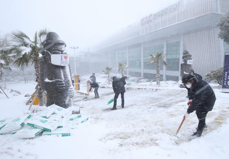 | ºÏ±Ø¹ß ÇÑÆÄ°¡ »çÈê° ±â½ÂÀ» ºÎ¸®°í ÀÖ´Â Áö³ 8ÀÏ Á¦ÁÖ±¹Á¦°øÇ× ÁÖÂ÷Àå ÀÔ±¸¿¡¼ Á÷¿øµéÀÌ ½×ÀÎ ´«À» Ä¡¿ì°í ÀÖ´Ù. |