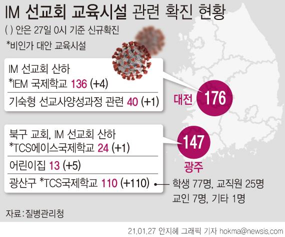 ¹æ¿ª´ç±¹ÀÌ 27ÀÏ 0½Ã±îÁö ¿ªÇÐÁ¶»ç¸¦ ½Ç½ÃÇÑ °á°ú ´ëÀü IEM±¹Á¦Çб³ °ü·Ã È®ÁøÀÚ 5¸íÀÌ ´Ã¾î ´©Àû 176¸íÀÌ´Ù. ±¤ÁÖ¿¡¼´Â ºÏ±¸ ¼ÒÀç ±³È¸¿Í IM¼±±³È¸ ºñÀΰ¡ ´ë¾È ±³À°½Ã¼³(TCS ¿¡À̽º) °ü·ÃÇØ 116¸íÀÇ È®ÁøÀÚ°¡ Ãß°¡µÅ ÃÑ 147¸íÀÌ °¨¿°µÆ´Ù.