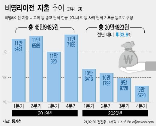 ºñ¿µ¸® ´Üü·ÎÀÇ ÀÌÀü Ç׸ñ¿¡´Â ±³È¸¡¤¼º´ç¡¤Àý µî Á¾±³ ´Üü ±âºÎ±Ý, 'À¯´Ï¼¼ÇÁ' µî »çȸ´Üü ±âºÎ±Ý, ´Üü ȸºñ µîÀÌ Æ÷ÇԵȴÙ. ÀÌ Áß ±³È¸ Çå±ÝÀÌ Å« ºñÁßÀ» Â÷ÁöÇÑ´Ù´Â °ÍÀÌ Åë°èûÀÇ ¼³¸íÀÌ´Ù. Åë°èû °ü°èÀÚ´Â "»çȸ´Üü ±âºÎ±ÝÀº ¿ù ´ÜÀ§¿¡ ±Ý¾×µµ 1¸¸~3¸¸¿ø ¼öÁØ"À̶ó¸é¼ "´Üü ȸºñÀÇ °æ¿ì¿¡µµ ÀϹÝÀûÀ¸·Î´Â ÀÚÁÖ, Å« ±Ý¾×À» ³»Áö´Â ¾Ê´Â´Ù"°í Çß´Ù.