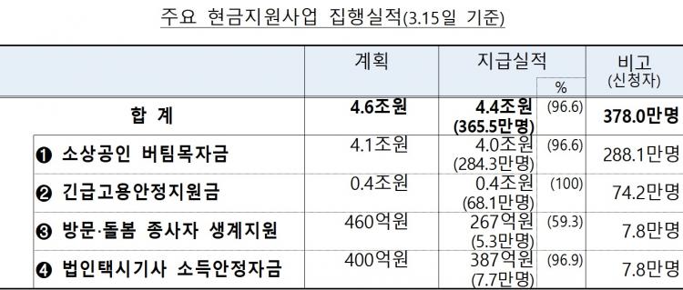 ÁÖ¿ä Çö±ÝÁö¿ø»ç¾÷ ÁýÇàÁ¡°Ë °á°ú 15ÀÏ ±âÁØ Áö¿ø´ë»ó 365¸¸5000¸í¿¡ ´ëÇØ 4Á¶4000¾ï¿øÀ» Áö±ÞÇÑ °ÍÀ¸·Î È®ÀεŠÁýÇà·üÀº 96.6%·Î ±â·ÏÇß´Ù.