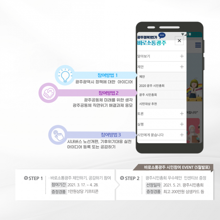 º¸´Ù »ì±â ÁÁÀº ±¤ÁÖ¸¦ ¸¸µé±â À§ÇÑ »ýȰ ¼Ó ¾ÆÀ̵ð¾î¸¦ °¡Áø ±¹¹Î ´©±¸³ª ¹Ù·Î¼ÒÅ뱤ÁÖ¿¡ Á¢¼ÓÇØ ´Ù¾çÇÑ ÀǰßÀ» Á¦½ÃÇÑ ÈÄ À̺¥Æ® Âü¿©°¡ °¡´ÉÇÏ´Ù.