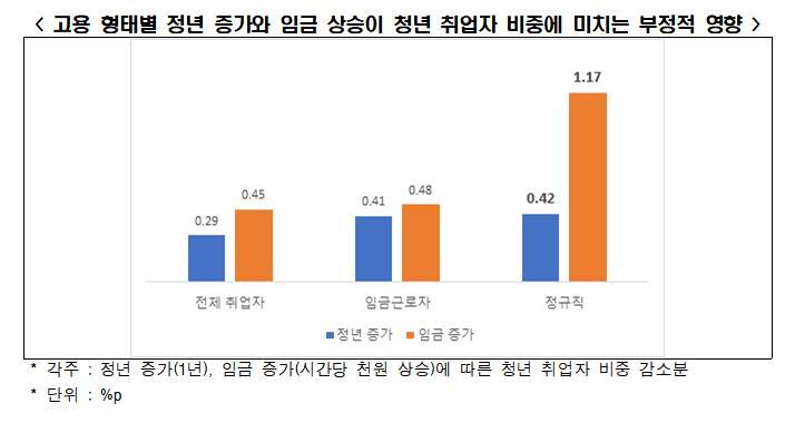 º¸°í¼´Â "Àüü Ãë¾÷ÀÚ³ª ÀӱݱٷÎÀÚ¸¦ ´ë»óÀ¸·Î ÇÒ ¶§º¸´Ù Á¤±ÔÁ÷ ±Ù·ÎÀÚ¸¦ ´ë»óÀ¸·Î ÇÒ ¶§ û³â Ãë¾÷ÀÚ ºñÁßÀÌ ÀӱݼöÁØ º¯È¿¡ ´õ ¹Î°¨ÇÏ°Ô ¹ÝÀÀÇÏ´Â °ÍÀº Á¤±ÔÁ÷ ±Ù·ÎÀÚÀÇ °æ¿ì ÇÑ ¹ø ä¿ëÇÏ¸é ³ôÀº °í¿ëº¸È£·Î ÀÎÇØ ÇØ°í°¡ ¾î·Á¿ö ±â¾÷µéÀÌ Á¤±ÔÁ÷ û³âÃþÀÇ Ãß°¡ °í¿ëÀ» »ó´ëÀûÀ¸·Î ´õ¿í ²¨¸®±â ¶§¹®"À̶ó°í ¹àÇû´Ù.