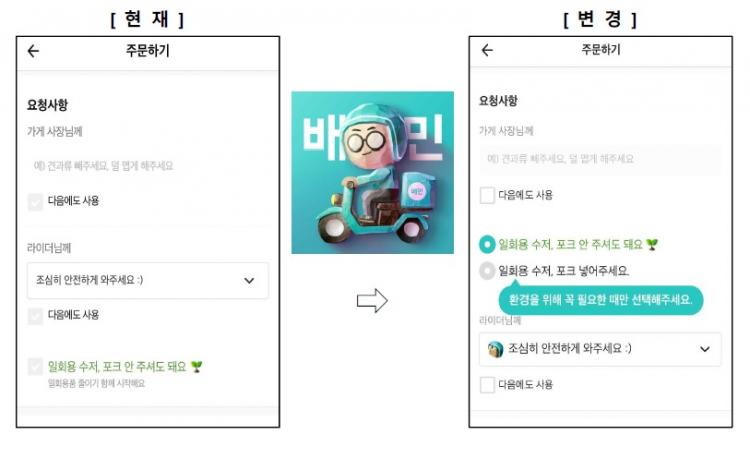 22ÀÏ È¯°æºÎ¿¡ µû¸£¸é ¹è´ÞÀÇ ¹ÎÁ·, ¿ä±â¿ä, ÄíÆÎÀÌÃ÷ ¹è´Þ¾Û 3°÷Àº À½½Ä ÁÖ¹® ½Ã ÀÏȸ¿ë ¼öÀú·ù¸¦ º°µµ·Î ¼±ÅÃÇϵµ·Ï ÇÏ´Â ½Ã½ºÅÛÀ» ¾Û ȸ鿡 Àû¿ëÇÑ´Ù.