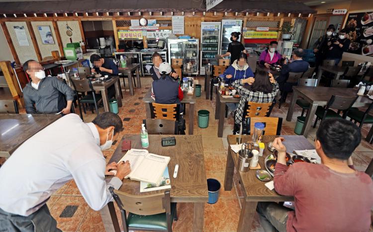 | °æºÏÀÇ Àα¸ 10¸¸¸í ÀÌÇÏ ±º Áö¿ª 12°÷¿¡¼ 5ÀÎ ÀÌ»ó »çÀû ¸ðÀÓÀ» Àü±¹ óÀ½À¸·Î Çã¿ëÇÏ´Â ½Ã¹ü ±â°£¿¡ µé¾î°£ 26ÀÏ °æºÏ °í·É±ºÀÇ ÇÑ À½½ÄÁ¡¿¡¼ ¼Õ´ÔµéÀÌ °Å¸®¸¦ À¯ÁöÇÑ Ã¤ ½Ä»ç¸¦ Çϰí ÀÖ´Ù. 2021.04.26. |