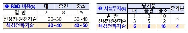 Á¤ºÎ´Â ¿ì¼± 'ÇÙ½ÉÀü·«±â¼ú'(°¡Äª)À» ½Å¼³ÇØ ¿¬±¸°³¹ß(R&D)´Â ÃÖ´ë 50%(´ë±â¾÷ ÃÖ´ë 40%), ½Ã¼³ÅõÀÚ´Â ÃÖ´ë 10~20%±îÁö ¼¼¾×°øÁ¦¸¦ ´ëÆø °ÈÇÑ´Ù. ÇÙ½ÉÀü·«±â¼úÀº ±¹°¡°æÁ¦¿¡¼ Â÷ÁöÇÏ´Â ºñÁßÀÌ ³ôÀº »ê¾÷°ú °ü·ÃµÇ°í, ±Û·Î¹ú °æÀï¿ìÀ§¸¦ ¼±Á¡¡¤À¯ÁöÇÒ Çʿ伺ÀÌ ÀÖ´Â Çٽɱâ¼úÀ» ¶æÇÑ´Ù.