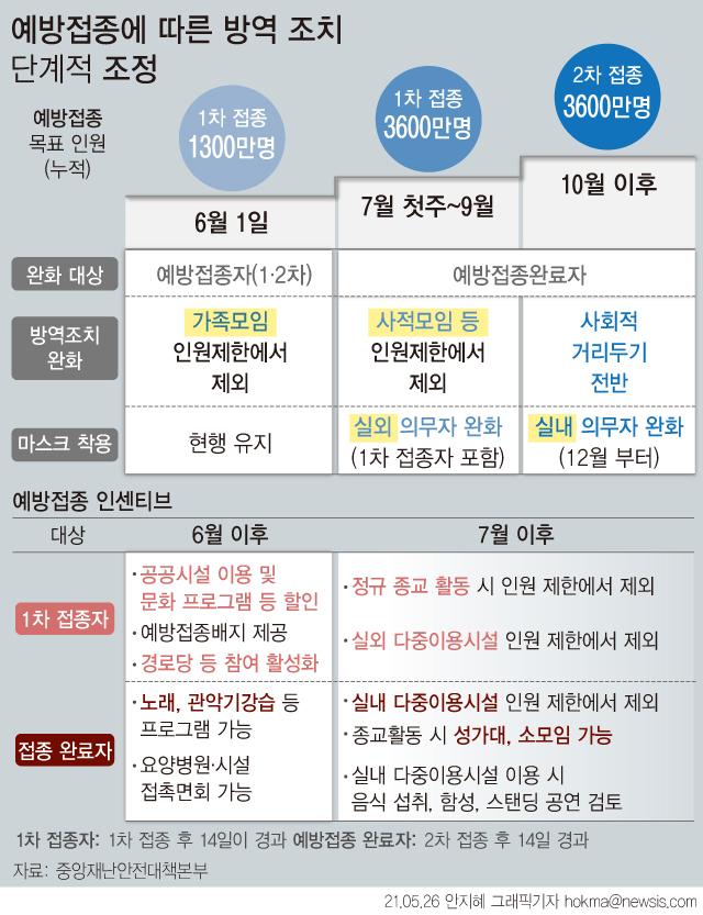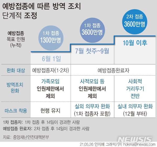 7¿ùºÎÅÍ´Â Àü ±¹¹ÎÀÇ 25%°¡ 1Â÷ Á¢Á¾À» ¿Ï·áÇÏ´Â Á¡À» °í·ÁÇØ °³ÆíµÈ »çȸÀû °Å¸®µÎ±â¸¦ ½ÃÇàÇÒ ¿¹Á¤ÀÌ´Ù. Á¤ºÎ´Â 6¿ù±îÁö 1300¸¸¸íÀÇ 1Â÷ Á¢Á¾ ¿Ï·á¸¦ ¸ñÇ¥·Î Çϰí ÀÖ´Ù.