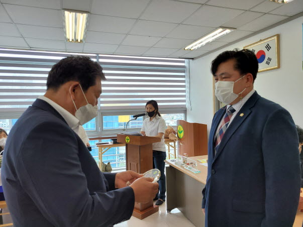| ¡ã ±¤ÁÖ±¤¿ª½Ã ¼±¸ Àü½ÂÀÏ ÀÇ¿øÀÌ ÃÖ´öȯ ±¤ÁÖ¼±¸»õ¸¶À»È¸ÀåÀ¸·ÎºÎÅÍ °¨»çÆÐ¸¦ ¼ö¿©¹Þ°í ÀÖ´Ù.<»çÁø=±¤ÁÖ ¼±¸ÀÇȸ Á¦°ø> |
