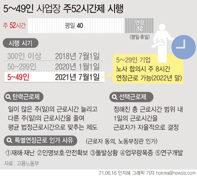 | ¿À´Â 7¿ùºÎÅÍ 5~49ÀÎ »ç¾÷Àåµµ ÁÖ52½Ã°£ ±Ù¹«Á¦ Àû¿ëÀ» ¹Þ°Ô µÈ´Ù. 5~49ÀÎ »ç¾÷ÀåÀÇ 95%¿¡ ÇØ´çÇÏ´Â 5~29ÀÎ »ç¾÷ÀåÀº 2022³â¸»±îÁö ±Ù·ÎÀÚ ´ëÇ¥¿Í ÇÕÀÇÇϸé 1ÁÖ 8½Ã°£ÀÇ Ãß°¡ ¿¬Àå ±Ù·Î¸¦ ÅëÇØ ÃÖ´ë 60½Ã°£±îÁö °¡´ÉÇÏ´Ù. |