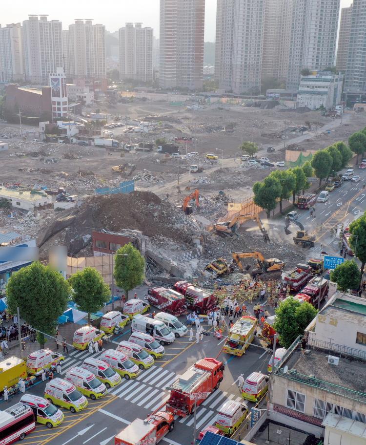 | 9ÀÏ ¿ÀÈÄ ±¤ÁÖ µ¿±¸ Çе¿ Àç°³¹ß±¸¿ª¿¡¼ ö°Å ÁßÀÌ´ø 5Ãþ °Ç¹°ÀÌ ºØ±«µÅ Áö³ª°¡´ø ¹ö½º¸¦ µ¤ÃÆ´Ù. 119 ¼Ò¹æ´ë¿øµéÀÌ ¹«³ÊÁø °ÇÃ๰¿¡ ¸Å¸ôµÈ ¹ö½º¿¡¼ ½Â°´ ±¸Á¶ ÀÛ¾÷À» ¹úÀ̰í ÀÖ´Ù. 2021.06.09. |