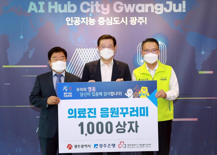 ±¤ÁÖÀºÇàÀº ¹«´õÀ§ ¼Ó ½Ã¿øÇÔÀ» ´õÇÏ´Â ¾Ë·Î¿¡ ¹Ì½ºÆ®, ºÎä µîÀÇ ¿©¸§¿ëǰ°ú È«»ï, Àüº¹Á× µîÀÇ °Ç°½Äǰ 17Á¾ÀÌ ´ã±ä ÀÀ¿ø²Ù·¯¹Ì 1000°³(5000¸¸¿ø »ó´ç)¸¦ ±¤ÁÖ½ÃÀÚ¿øºÀ»ç¼¾ÅÍ¿¡ ±âºÎÇß´Ù.