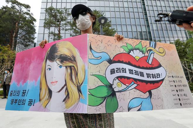 6ÀÏ ¿ÀÈÄ ¼¿ï °³²±¸ Á¶¼±ÆÓ¸®½º È£ÅÚ ¾Õ¿¡¼ 40´ë ¿©¼º A¾¾°¡ ¡®Á츮ÀÇ ¹üÁ˸¦ ¹àÇô¶ó¡¯, ¡®Á츮ÀÇ ²Þ! ¿µºÎÀÎÀÇ ²Þ!¡¯À̶ó´Â ¹®±¸°¡ ´ã±ä Á¾ÀÌÆÇÀ» µé°í 1ÀÎ ½ÃÀ§¸¦ Çß´Ù. A¾¾´Â ¡°±¹¹ÎÀÇ ±Ç¸®¸¦ Ç¥ÇöÇÏ·¯ ³ª¿Ô´Ù¡±¸ç ¡°Á츮°¡ ¹üÁËÀÚ¶ó°í »ý°¢Çϸç Á¤Ã¼°¡ ±Ã±ÝÇÏ´Ù¡±°í ¸»Çß´Ù.