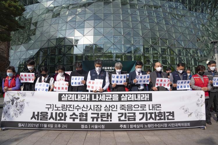 À̳¯ ±âÀÚȸ°ß¿¡¼ ½Ã¹Î´ëÃ¥À§´Â "A¾¾´Â ±¸ ½ÃÀå¿¡¼ ¿µ¾÷À» ÇÏ´ø ´ç½Ã ¼öÇùÁ÷¿øµéÀÇ Æø·Â°ú ¸íµµÁýÇà ¶§ ¿ë¿ªÀÇ ÆøÇàÀ¸·Î º´¿øÄ¡·á¸¦ ¹Þ°í, °øÆ÷°¨ÀÇ ½ºÆ®·¹½º¿Í Æ®¶ó¿ì¸¶¸¦ È£¼ÒÇß´Ù"¸é¼ "A¾¾ÀÇ Á×À½Àº ³ë·®Áø¼ö»ê½ÃÀå Çö´ëÈ»ç¾÷À» µÑ·¯½Ñ °¥µî°ú ¼¿ï½ÃÀÇ Á÷¹«À¯±â, ¼öÇùÀÇ Æø·ÂÀÌ ¸¸µé¾î³½ »çȸÀû Ÿ»ì"À̶ó°í ÁÖÀåÇß´Ù.