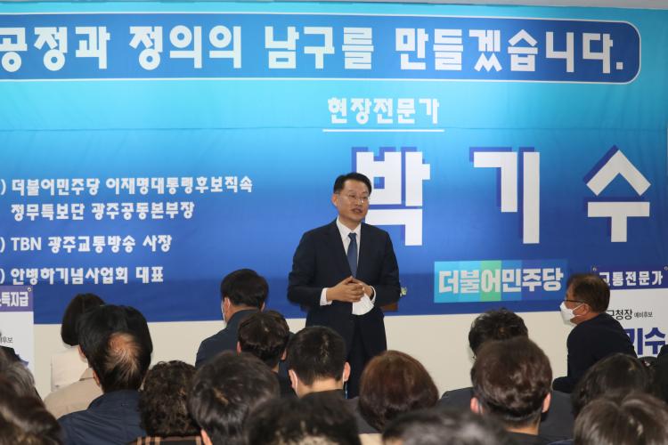 °±âÁ¤ ±¤ÁÖ±¤¿ª½ÃÀå ¿¹ºñÈ帴 ¡°5³â Àü ¹Ú±â¼ö Èĺ¸¿Í ÃÖ¿µÈ£ ³²±¸Ã»Àå, ±×¸®°í ¹ÎÇü¹è ±¤»ê±¸Ã»Àå°ú ÇÔ²² ¿øÆÀÀÌ µÇ¾î ¶Ù¾ú´ø Àο¬À» ¼Ò°³Çϰí, ±³Åë¹æ¼Û »çÀåÀ» ¿ªÀÓÇÑ ¹Ú±â¼ö È帴 ¾ð·Ð ¹æ¼ÛÀ» ÅëÇØ »ì¾ÆÀÖ´Â ¹Î½ÉÀ» µè´Âµ¥ ¾ÆÁÖ Àͼ÷ÇÑ »ç¶÷ÀÌ´Ù¡±¶ó°í ¼Ò°³Çß´Ù.