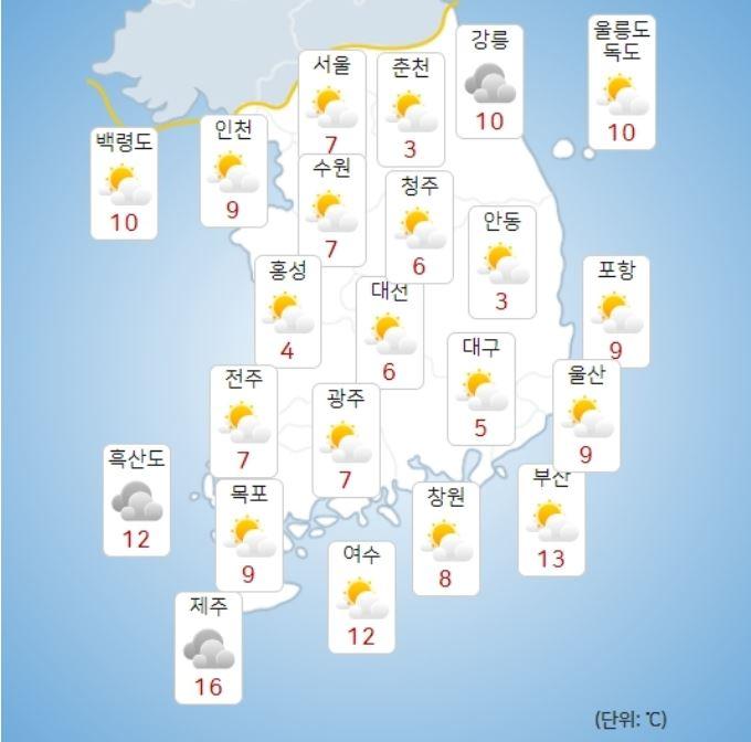 ÁÖ¿ä µµ½Ãº°, Áö¿ªº° ¾ÆÄ§ ÃÖÀú±â¿ÂÀº ¡â¼¿ï 7µµ ¡âÀÎõ 8µµ ¡âÃáõ 3µµ ¡â°¸ª 10µµ ¡â´ëÀü 6µµ ¡â´ë±¸ 5µµ ¡âÀüÁÖ 6µµ ¡â±¤ÁÖ 7µµ ¡âºÎ»ê 13µµ ¡âÁ¦ÁÖ 15µµ´Ù.
