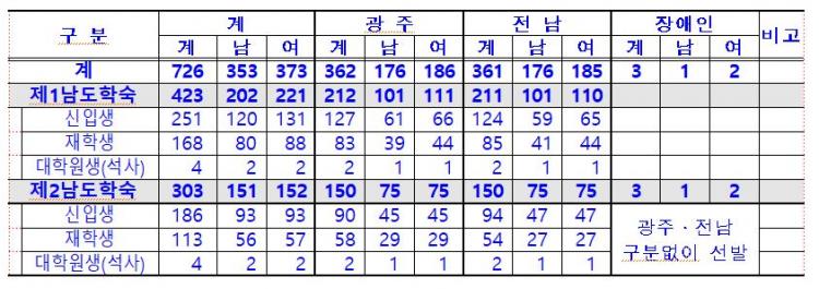 ¸ðÁýÀοøÀº ÃÑ 726¸íÀÌ´Ù. Çм÷º°·Î Á¦1³²µµÇм÷(µ¿ÀÛ±¸) 423¸í, Á¦2³²µµÇм÷(ÀºÆò±¸) 303¸íÀ¸·Î Èñ¸ÁÇÏ´Â °÷À» ¼±ÅÃÇÏ¿© Áö¿øÇÏ¸é µÈ´Ù. ½Ã‧µµº°·Î´Â ±¤Áֽà 362¸í, Àü³²µµ 361¸í, Á¦2³²µµÇм÷ Àå¾ÖÀÎ 3¸íÀ¸·Î, Àå¾ÖÀνÇÀº Çлý ÆíÀǸ¦ À§ÇØ ½Ã‧µµ ±¸ºÐ ¾øÀÌ ÀÔ»çÇÒ ¼ö ÀÖ´Ù.