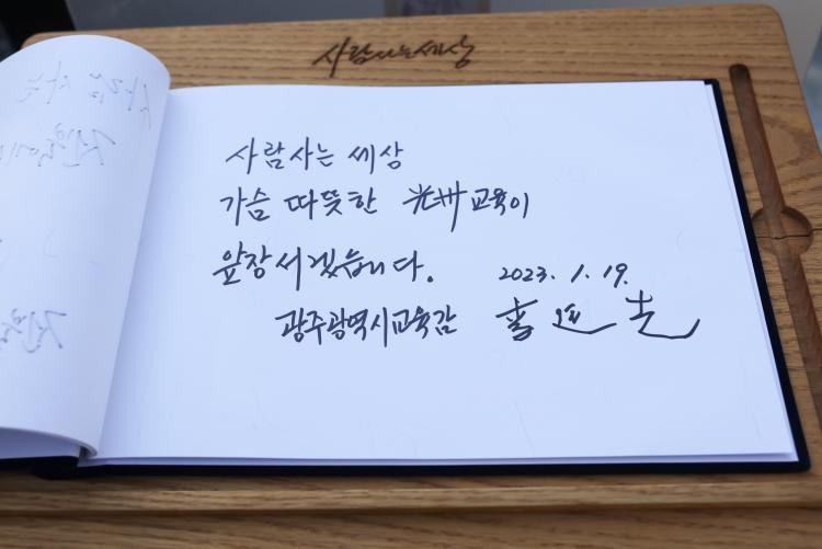 ÀÌ ±³À°°¨Àº À̳¯ ³ë Àü ´ëÅë·É ¹¦¼Ò¿¡ ±¤Áֽñ³À°Ã» ¸íÀÇÀÇ ÇåÈ¿Í ºÐÇâÀ» ÇÑ µÚ ±¤ÁÖ±³À°ÀÇ »õ·Î¿î ¹Ì·¡¸¦ ´ÙÁüÇÏ´Â ¹æ¸í·ÏÀ» ÀÛ¼ºÇß´Ù. ¹æ¸í·Ï¿¡´Â ¡®»ç¶÷ »ç´Â ¼¼»ó. °¡½¿ µû¶æÇÑ ±¤ÁÖ±³À°ÀÌ ¾ÕÀå¼°Ú½À´Ï´Ù¡¯°í Àû¾ú´Ù.