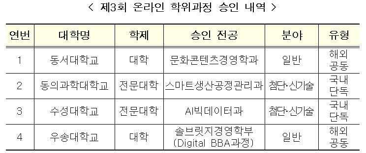 ¡®ÀϹݴëÇÐÀÇ ¿Â¶óÀÎ ÇÐÀ§°úÁ¤¡¯Àº ±³À°ºÎÀÇ »çÀü ½É»ç ¹× ½ÂÀÎÀ» ÅëÇØ ¿ø°Ý´ëÇÐ(»çÀ̹ö´ë µî)ÀÌ ¾Æ´Ñ ÀϹݴëÇп¡¼ ´ë¸é¼ö¾÷ º´Çà ¾øÀÌ ¿Â¶óÀÎ ¼ö¾÷¸¸À¸·Îµµ (Àü¹®)ÇÐ»ç ¶Ç´Â ¼®»çÇÐÀ§¸¦ ÃëµæÇÒ ¼ö ÀÖ´Â Á¦µµ·Î¼, 2021³â 2¿ù µµÀÔµÈ ÀÌÈÄ, 2Â÷·Ê ½ÂÀÎ ½É»ç¸¦ °ÅÃÄ 2023Çг⵵ ÇöÀç 22°³ ´ëÇÐ(¿ø)ÀÇ 27°³ ¼®»ç°úÁ¤ÀÌ ¿Â¶óÀÎ ÇÐÀ§°úÁ¤À¸·Î ¿î¿µÇϰí ÀÖ´Ù.