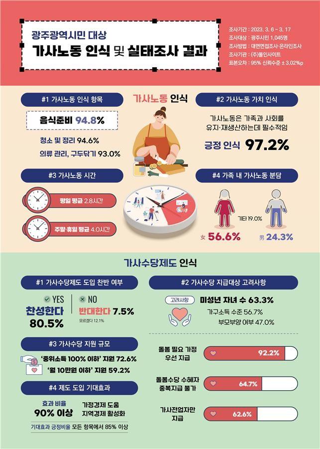 °¡»ç³ëµ¿ ½ÇÅÂÁ¶»ç °á°ú, ±¤ÁֽùÎÀÇ ÆòÀÏ °¡»ç³ëµ¿Àº Æò±Õ 2.8½Ã°£, ÁÖ¸»°ú ÈÞÀÏ¿¡´Â Æò±Õ 4½Ã°£ ÅõÀÔÇÏ´Â °ÍÀ¸·Î ³ªÅ¸³µ´Ù. °¡Á· ³» °¡»ç³ëµ¿ ºÐ´ãÀº ¿©¼ºÀÌ 56.6%, ³²¼º 24.3%·Î, ¿©¼ºÀÌ ³²¼ºº¸´Ù 2¹è ÀÌ»ó ´ã´çÇÏ´Â °ÍÀ¸·Î Á¶»çµÆ´Ù. °¡»ç³ëµ¿Àº À½½Ä Áغñ(94.8%), û¼Ò ¹× Á¤¸®(94.6%), ÀÇ·ù°ü¸® ¹× ±¸µÎ´Û±â(93.0%) µîÀÌ ÁÖ¸¦ ÀÌ·ð´Ù.