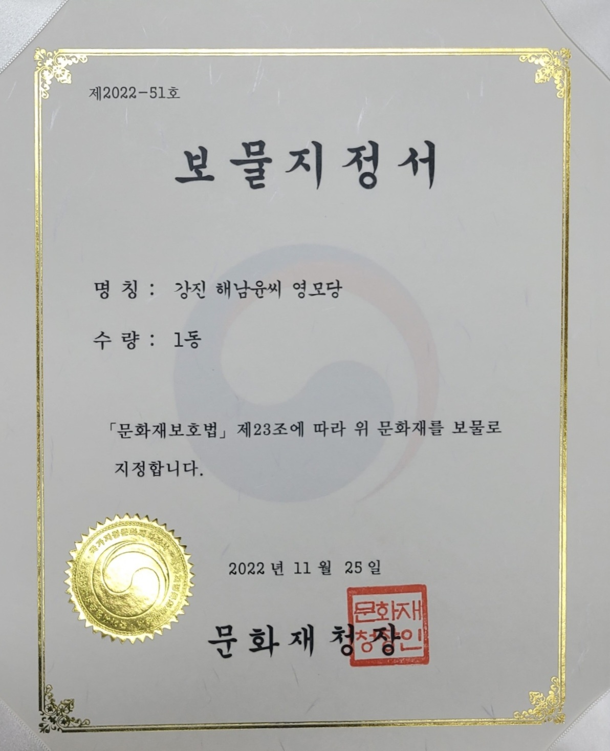 ±Ý ¹ø ±¹°¡ÁöÁ¤¹®ÈÀç º¸¹°·Î ÁöÁ¤µÈ °Áø±º µµ¾Ï¸é ÇØ°·Î ÇÑõµ¿ÀÇ ÇØ³²À±¾¾ ¿µ¸ð´çÀº ÇØ³²À±¾¾ ¹®ÁßÀÇ Á¦°¢À¸·Î Á¶¼± ¼÷Á¾ 13³â(1687)¿¡ ÁöÀº °Ç¹°ÀÌ´Ù.
