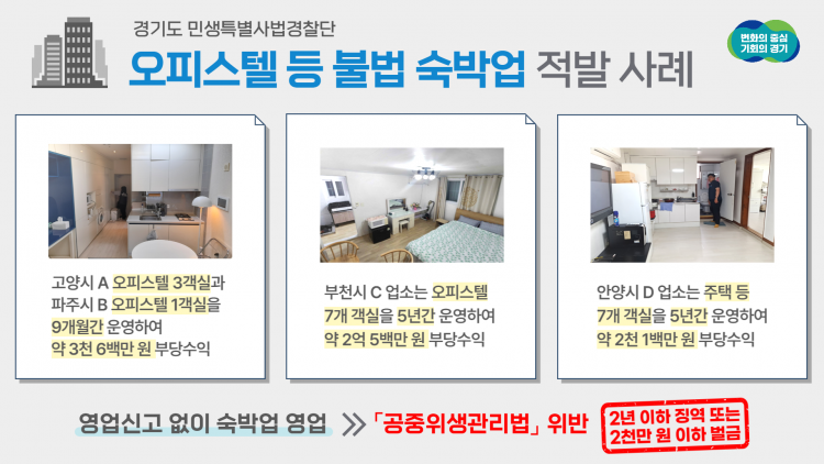 °æ±âµµ Ưº°»ç¹ý°æÂû´ÜÀº Áö³ 5¿ù 15ÀϺÎÅÍ 26ÀϱîÁö ¼ö¿ø, ºÎõ, ¼º³², °í¾ç µî 11°³ Áö¿ª¿¡¼ ºÒ¹ý¿µ¾÷À¸·Î ÀǽɵǴ ¼÷¹Ú¾÷¼Ò¿¡ ´ëÇÑ ´Ü¼ÓÀ» ¹ú¿© ¹Ì½Å°í ¿µ¾÷ 36°÷ 103°³ °´½ÇÀ» Àû¹ßÇß´Ù°í 15ÀÏ ¹àÇû´Ù.