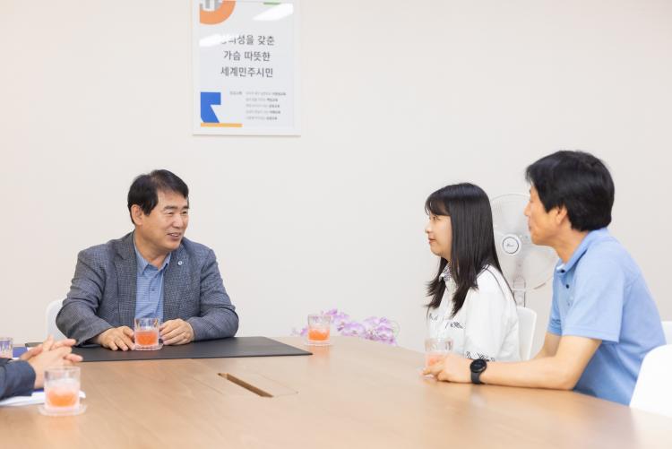 [´ëÇÑ¿©¼ºÀϺ¸ = ±èµÎ·ç¹Ì ±âÀÚ] ÀÌÁ¤¼± ±³À°°¨ÀÌ 12ÀÏ ±³À°°¨½Ç¿¡¼ ±¤ÁÖÀÚµ¿È¼³ºñ¸¶À̽ºÅÍ°í ±è¹ÎÁö ÇлýÀ» °Ý·ÁÇß´Ù. ±è¹ÎÁö ÇлýÀº Áö³ 2ÀÏ °¢ °è¿ ¿ì½ÂÀڵ鸸 Âü¿©ÇÑ EBS ÀåÇÐÄûÁî ¿ÕÁß¿ÕÀü¿¡ ÃâÀüÇØ ¿ì½ÂÇß´Ù.