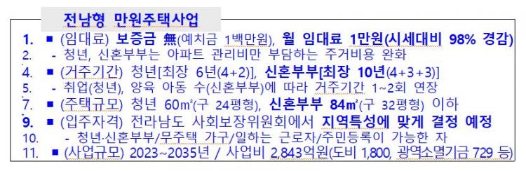 Àü³²Çü ¸¸¿øÁÖÅà »ç¾÷Àº Áö³ 9¿ù 6ÀÏ ±è¿µ·Ï Àü³²µµÁö»ç°¡ ¹ßÇ¥ÇÑ Ã»³âÃþ ¸ÂÃãÇü ÁÖ°ÅÁ¤Ã¥ÀÌ´Ù. ½ÅÈ¥ºÎºÎ¸¦ À§ÇÑ Àü¿ë¸éÀû 84§³(32ÆòÇü) ÀÌÇÏÀÇ ÁÖÅÃ, û³âÀ» À§ÇÑ Àü¿ë¸éÀû 60§³(17ÆòÇü) ÀÌÇÏÀÇ ÁÖÅÃÀ» ½ÅÃàÇØ ÃÖÀå 10³â°£ º¸Áõ±Ý ¾øÀÌ ¿ù 1¸¸ ¿ø¿¡ Á¦°øÇÏ°Ú´Ù°í ¹àÇô ÆÄ°ÝÀûÀÌÁö¸¸ ²À ÇÊ¿äÇÑ Á¤Ã¥À̶ó´Â Æò°¡¸¦ ¹Þ°í ÀÖ´Ù. ÀÌ ¶§¹®¿¡ Àü³²Çü ¸¸¿øÁÖÅà ¹ßÇ¥ ÀÌÈÄ ÇØ´ç ºÎ¼¿¡ µµ¹ÎÀÇ °Ý·Á¿Í È®´ë¸¦ ¹Ù¶ó´Â ÀÀ¿øÀÇ ÀüȰ¡ ¿À°í ÀÖ´Ù.