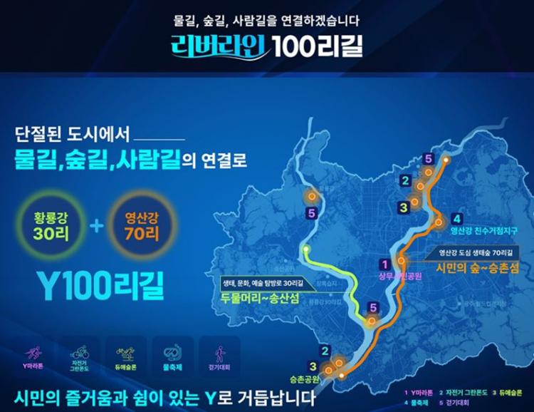¸¶Áö¸·À¸·Î ¡®¸®¹ö¶óÀÎ 100¸®±æ¡¯Àº ¿µ»ê° 30¸®, Ȳ·æ° 70¸® µî 100¸®¸¦ µû¶ó ¹°±æ, ½£±æ, »ç¶÷±æÀ» ¿¬°áÇØ ±¤ÁÖ¸¦ º¸ÇàÁ߽ɵµ½Ã·Î ȸº¹ÇØ °¡°Ú´Ù´Â Àü·«ÀÌ´Ù.