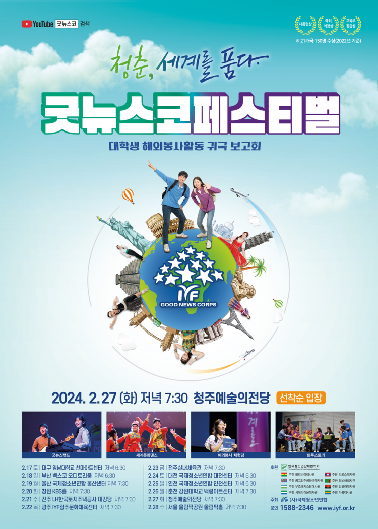 2024 ±Â´º½ºÄÚ Æä½ºÆ¼¹úÀº¡®Ã»Ãá, ¼¼°è¸¦ ǰ´Ù¡¯¶ó´Â ÁÖÁ¦·Î ¿¸°´Ù. ÀÌ Æä½ºÆ¼¹úÀº 1³â µ¿¾È ÇØ¿Ü¿¡¼ ºÀ»çȰµ¿À» ¸¶Ä¡°í ±Í±¹ÇÑ ´ëÇлý ºÀ»ç´Ü¿øµéÀÌ ÇöÁö¿¡¼ ¹è¿î °ªÁø °æÇè°ú µµÀüÀ¸·Î ¾òÀº ÇູÀ» ½Ã¹Îµé°ú ³ª´©´Â µ¥¿¡ Àǹ̰¡ ÀÖ´Ù.