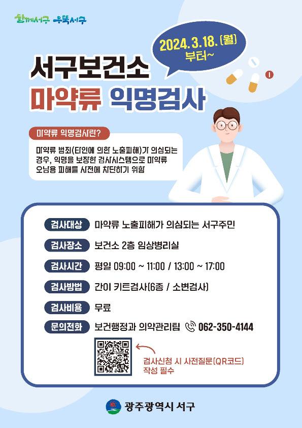 °Ë»ç ´ë»óÀº ¸¶¾à·ù ³ëÃâ ÇÇÇØ°¡ ÀǽɵǴ ¼±¸ÁÖ¹ÎÀ¸·Î QRÄڵ带 ÅëÇÑ »çÀüÁú¹® ÀÛ¼º ÈÄ °Ë»ç°¡ °¡´ÉÇÏ¸ç ºñ¿ëÀº Àü¾× ¹«·á´Ù. ´Ü ¹ýÀûÁ¶Ä¡¸¦ Èñ¸ÁÇÏ´Â ¸¶¾à·ù ¹üÁË ÇÇÇØÀÚ, ¸¶¾à Áßµ¶¡¤ÀçȰ Ä¡·áÀÚ, Á÷¹« °ü·Ã °Ë»ç Èñ¸ÁÀÚ, ÃÖ±Ù 2ÁÖ À̳» ÀÇ·á ¸ñÀû ¸¶¾à·ù ¾à¹° »ç¿ëÀÚ µîÀº ´ë»ó¿¡¼ Á¦¿ÜµÈ´Ù.