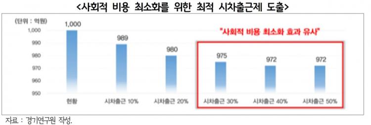 º¸°í¼¿¡¼´Â À¯¿¬±Ù¹«Á¦µµ Áß ÀÏÇÏ´Â ¹æ½ÄÀÇ º¯È°¡ Àû¾î Á÷ÀåÀεéÀÌ °¡Àå ¸¹ÀÌ È°¿ëÇϰí ÀÖ´Â ½ÃÂ÷ÃâÅð±ÙÁ¦µµ¸¦ Ȱ¿ëÇÑ ±³Åë¹®Á¦ ÇØ°á ¹æ¾ÈÀ» ¸ð»öÇÏ¿´´Ù. ±³ÅëÈ¥Àâ¿¡ µû¸¥ »çȸÀû ºñ¿ë ÃÖ¼ÒÈ¿Í ½Ã¹ÎµéÀÇ ¼ö¿ë °¡´É¼º µîÀ» °í·ÁÇÑ ÃÖÀû ½ÃÂ÷ÃâÅð±Ù ¹æ¾ÈÀ¸·Î Á÷ÀåÀÎÀÇ 10%°¡ 1½Ã°£ ÀÏÂï Ãâ±ÙÇϰí, Á÷ÀåÀÎÀÇ 20%°¡ 1½Ã°£ ´Ê°Ô Ãâ±ÙÇÏ´Â ½ÃÂ÷ÃâÅð±ÙÁ¦µµ Âü¿©À² 30%¸¦ Á¦¾ÈÇÏ¿´´Ù.