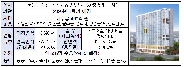 2026³â Áذø ¿¹Á¤ÀÎ ¿ë»ê ´ëÇлý ¿¬ÇÕ±â¼÷»ç´Â ±¹ÅäºÎ°¡ ¹«»óÀ¸·Î Á¦°øÇÑ Ã¶µµ À¯ÈÞºÎÁö¿¡ Çѱ¹¼ö·Â¿øÀÚ·Â ¹× ¿øÀü ¼ÒÀç ÁöÀÚü(±âÀ屺, ¿ïÁÖ±º, °æÁÖ½Ã, ¿µ±¤±º)ÀÇ ±âºÎ±Ý(460¾ï ¿ø)À¸·Î Çѱ¹ÀåÇÐÀç´ÜÀÌ °Ç¸³‧¿î¿µÇÑ´Ù. ¾à 595¸í(500¸íÀº ¿øÀü ¼ÒÀç ÁöÀÚü Ãâ½Å Çлý ¿ì¼± ¹èÁ¤)À» ¼ö¿ëÇÏ´Â ¿¬ÇÕ±â¼÷»ç´Â Á¤ºÎ¡¤°ø°ø±â°ü¡¤ÁöÀÚü°¡ ´ëÇлýÀÇ ÁÖ°Å ºÎ´ã °æ°¨À» À§ÇØ Çù·ÂÇÏ¿´´Ù´Â Á¡¿¡¼ Àǹ̸¦ °¡Áø´Ù.