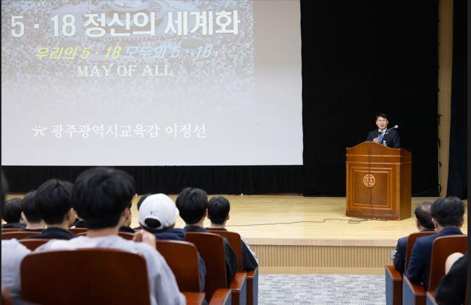 ÀÌ ±³À°°¨Àº Ư°¿¡¼ ¡°5¡¤18¹ÎÁÖȿÀº ºÒÀÇ¿¡ ÀúÇ×ÇÑ ½Ã¹ÎµéÀÇ À§´ëÇÑ Ç×ÀïÀ̾úÀ¸¸ç, 80³â ¿À¿ù, ±¤ÁÖ´Â ¼¶Ã³·³ °í¸³µÇ¾úÁö¸¸, ±¤ÁֽùÎÀÌ º¸¿©ÁØ Ç×ÀïÀÇ Á¤½ÅÀº ¿À´ÃÀÇ Á¤ÀÇ·Î °è½ÂµÇ¾ú´Ù¡±°í ¼³¸íÇß´Ù. À̾î 5¡¤18Á¤½ÅÀÌ ±¤ÁÖ¸¦ ³Ñ¾î ´ëÇѹα¹ÀÇ ÀÚ¶û½º·¯¿î ¿ª»çÀ̰í, ¼¼°è·Î È®»êÇØ¾ß ÇÏ´Â ¼þ°íÇÑ ÀηùÀÇ ÀÚ»êÀ̶ó¸ç, ±¤ÁÖ±³À°Ã»ÀÌ °Á¶ÇÏ´Â 5¡¤18 ¼¼°èÈÀÇ Çʿ伺À» ¿ª¼³Çß´Ù.