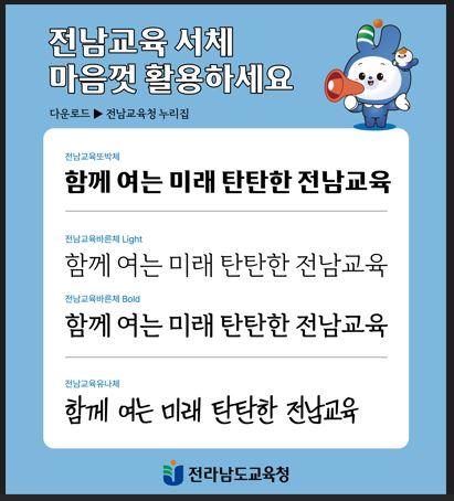 À̹ø¿¡ °³¹ßµÈ Àü³²±³À° Àü¿ë¼Ã¼´Â °íµñ °è¿(¶Ç¹Úü), ¸íÁ¶ °è¿(¹Ù¸¥Ã¼), ¼Õ±Û¾¾ °è¿(À¯³ªÃ¼) µî 3°¡Áö ŸÀÔÀÇ ±Û¾¾Ã¼ 4Á¾À̸ç ÇÑ±Û 2780ÀÚ, ¿µ¹® 94ÀÚ, Ư¼ö¹®ÀÚ 986ÀÚ·Î ±¸¼ºµÆ´Ù. ¡®¶Ç¹Úü¡¯´Â ±âÁ¸ ·Î°í¿¡ Çö´ëÀû °¨°¢À» ´õÇßÀ¸¸ç, ¡®¹Ù¸¥Ã¼¡¯´Â ³ë·ÂÀÇ ¹°¹æ¿ïµéÀÌ ¸ð¿© ¹Ì·¡¸¦ ¸¸µé¾î°¡´Â ¸ð½ÀÀ» Çü»óÈÇß´Ù. ¶Ç, ¡®À¯³ªÃ¼¡¯´Â Áö³ÇØ ´ë±¹¹Î ¼Õ±Û¾¾ °ø¸ðÀüÀ» ÅëÇØ ¼±Á¤µÈ ½ÇÁ¦ Çкθð ±Û¾¾Ã¼¶ó´Â Á¡¿¡¼ °øµ¿Ã¼ Âü¿©ÀÇ Àǹ̸¦ ´õÇÑ´Ù. ƯÈ÷, 3°¡Áö ŸÀÔ ¸ðµÎ µðÁöÅÐ ±³°ú¼ ½Ã´ë¿¡ ¹ß¸ÂÃç ¸ð¹ÙÀÏ ¹× À¥¿¡¼µµ ±ÛÀÚ°¡ ±ò²ûÇÏ°Ô Ç¥ÇöµÉ ¼ö ÀÖµµ·Ï ¿Â¶óÀΠȯ°æÄ£ÈÀûÀ¸·Î °³¹ßµÆ´Ù.