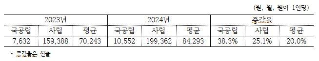 ±³À°ºÎ°¡ ´õºÒ¾î¹ÎÁÖ´ç ±è¹®¼ö ÀÇ¿ø½Ç·Î Á¦°øÇÑ ÀÚ·á¿¡ µû¸£¸é, 2024³â ÇкθðºÎ´ã±ÝÀº ¿ø¾Æ 1ÀÎ´ç ±¹°ø¸³ 1¸¸ 552¿ø, »ç¸³ 19¸¸ 9õ 362¿ø, Æò±Õ 8¸¸ 4õ 293¿øÀÌ´Ù. Àü³âµµ 2023³â¿¡ ºñÇØ ±¹°ø¸³°ú »ç¸³Àº °¢°¢ 38.3%¿Í 25.1% Áõ°¡Çß´Ù. Æò±ÕÀº 20.0% ´Ã¾ú´Ù.