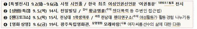 9¿ù 5ÀÏ ¿ÀÈÄ 2½Ã ÀüÀϺôµù¿¡¼´Â Ȳ±Ý¸í·û °»çÀÇ ¡®Á¨´õ ºÒÆòµî°ú Æø·Â¿¹¹æ¡¯À» ÁÖÁ¦·Î ÇÑ ¼ºÆòµî Ư°ÀÌ ÁøÇàµÈ´Ù. °°Àº ³¯ ¿ÀÈÄ 3½Ã Àü³²´ë¿¡¼´Â Áö¿ª ¿©¼ºÈ°µ¿°¡µéÀÇ ´Ù¾çÇÑ È°µ¿°æÇè À̾߱⸦ ´Ù·ç´Â Á¨´õÅäÅ©¼î°¡ À̾îÁø´Ù.