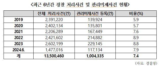 °æÂûÀÌ Ã³¸®ÇÑ Àüü ¼ö»ç »ç°ÇÀº 2019³â 239¸¸ 1,220°Ç, 2020³â 240¸¸ 2,134°Ç¿¡¼­ 2021³â 220¸¸ 6,289°ÇÀ¸·Î °¨¼ÒÇßÀ¸³ª, ÀÌÈÄ 2022³â 242¸¸ 1,602°Ç, 2023³â 260¸¸ 2,199°ÇÀ¸·Î ¸Å³â Áõ°¡Çß´Ù. Àüü »ç°Ç ´ëºñ °ü¸®¹ÌÁ¦»ç°Ç µî·Ï ºñÀ²µµ 2020³â 5.7%¿¡¼­ 2021³â 7.6%, 2022³â 8.9%, 2023³â 8.8%·Î ³ô¾ÆÁ³´Ù.